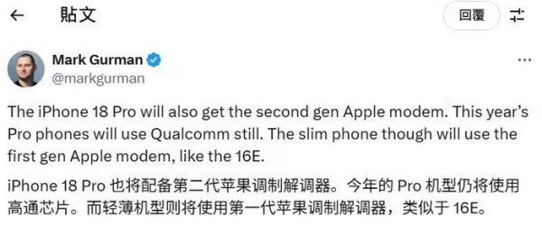 古尔曼昨天爆料说,iPhone 18 Pro 会用上苹果自己研发的第二代基带,可今年的 iPhone 17 Pro 还得接着用高通的基带。