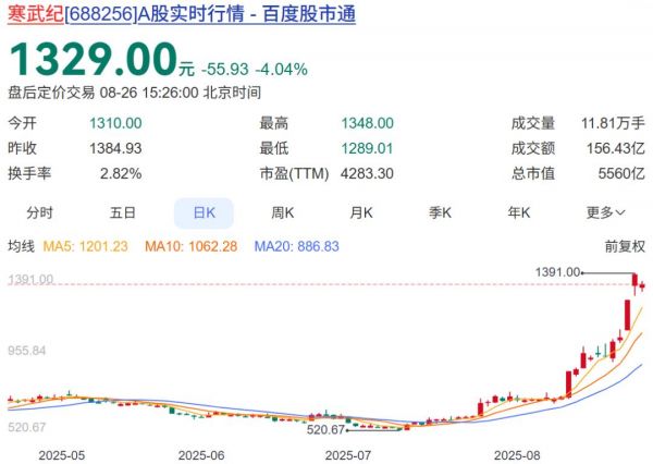 截至8月26日收盘,市值突破5500亿元大关,市盈率超过恐怖的4000多倍,在A股傲视群雄。