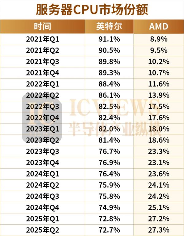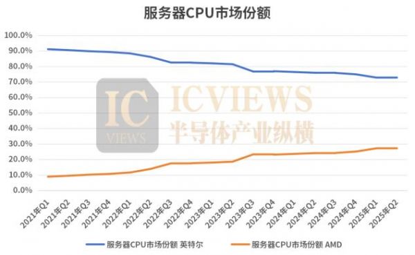 相比之下,由于最新的EPYC平台升级,AMD在2025年Q1实现了同比增长3.6%、环比增长2.1%的强劲增长。Q2,该公司的市场份额达到27.3%。