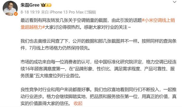 8月25日,格力电器(000651.SZ)市场总监朱磊在微博发帖再次反驳格力小米7月销量数据之争,并表示“数据可以转发,口碑没法P图”,号召同行加入格力“十年免费保修”计划。