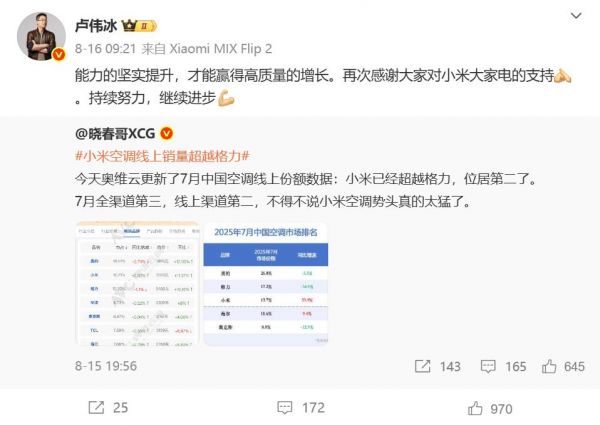 事件起因是,小米集团(01810.HK)合伙人、总裁卢伟冰8月16日在微博转发用户“晓春哥XCG”的一条帖子,该帖子截图显示,7月中国空调线上销售份额排行榜上,小米已经超越格力,位居第二。