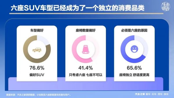 如今,六/七座SUV已经成为新的消费风尚。据汽车之家调研数据显示,在选购六座车型时,76.6%的用户更偏好选择SUV,而其中41.4%的用户目标明确,仅考虑六座版本,而非六七座均可。他们大部分认为,六座版的车型座位相对更加独立,舒适度也更高。