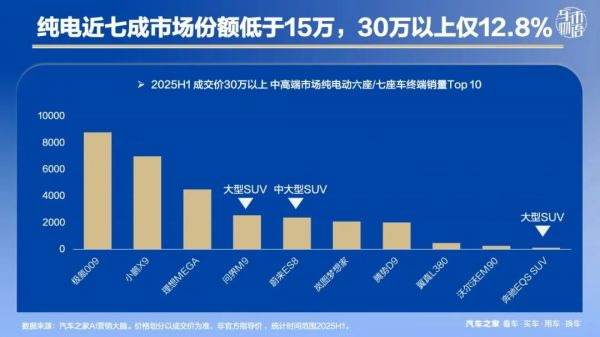 只看纯电销量,2025上半年销量成绩最好的极氪009累计也未能超过9000辆,平均月销量不足1500辆。如果只是这样的成绩,是很难撑起一款车型长期销售的。而纵观Top 10车型,仅有3款是SUV。买六/七座MPV依然是首选?其实不然。