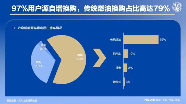 据汽车之家调研数据显示,六座新能源车的意向用户中,高达97%的用户来自增换购需求,而在换购需求用户中,近八成是传统燃油车主。