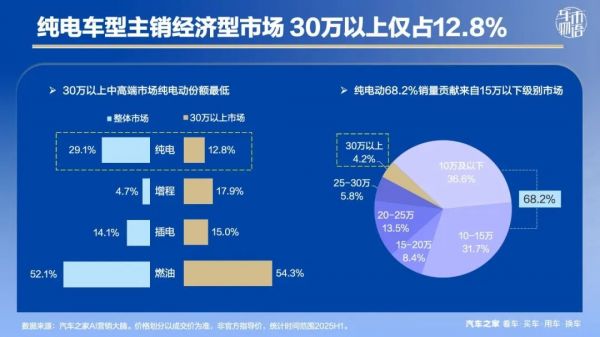 据汽车之家AI营销大脑数据显示,2025年上半年,纯电动市场的销量贡献主要来自成交价15万以下车型,占比高达68.2%,30万元以上中高端市场占比近4.2%。