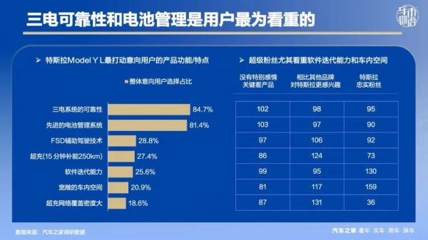 为什么选择特斯拉车型?从调研数据我们明显的看到,Model Y L最能打动用户的是三电系统的可靠性和先进的电池管理系统,占比均超过80%,有着绝对的话语权。这对没有特斯拉品牌滤镜的普通用户而言,显得更为重要,其选择占比TGI均超过100。