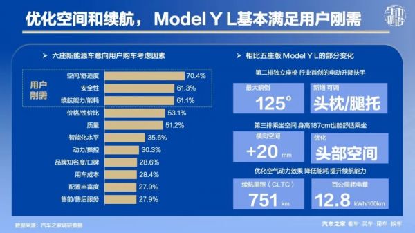 在用户购车考虑因素中,空间/舒适度、安全性和续航能力/能耗是首要考虑的三个条件,且选择占比均超过60%,是用户的绝对刚需。好在Model Y L并没有吝啬和任性,不论是第二排还是第三排,空间都全方位照顾到,续航里程也比Model Y还多1km。但,仅靠这些肯定是不够的。