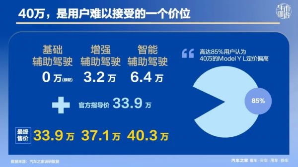 价格,是一个难以逾越的鸿沟。Model Y L官方指导价33.9万元,如果付费解锁“智能辅助驾驶”,总价将超过40万,这是一个85%用户都觉得偏高的定价。基础驾驶日常使用也足以,有何必要再去额外花钱呢?