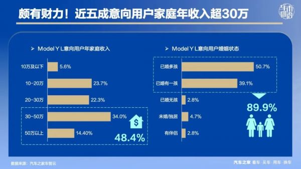 48.4%的用户家庭年收入可以达到30万以上,每个月6642元的月供应该不是问题。他们当中近九成用户是已婚已育家庭,对六座车型有着更高的需求。特别是那些Model Y和Model 3车主,同品牌换购Model Y L的可能性更大。