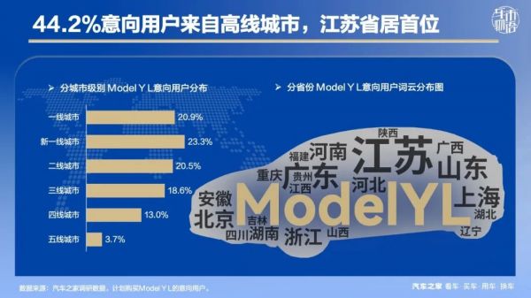 Model Y L能否成功破圈,关键在于“人和”,那么它的意向用户是怎样的呢。据调研数据显示,Model Y L的意向用户主要来自高线城市,占比44.2%。分省份看,其中江苏省位居首位。高线城市的用户更容易接受新事物,最重要的是他们的经济能力也相对更强。