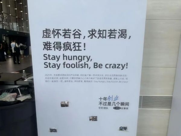 钉钉在会场的一角设置了十周年的创业回顾,几乎都是无招的金句,团队穿回了印有「BE CRAZY」(保持疯狂)的T恤,一位来自广东的制造企业IT负责人向「硅基研究室」形容她的感受,“一个更狠的钉钉回来了”。