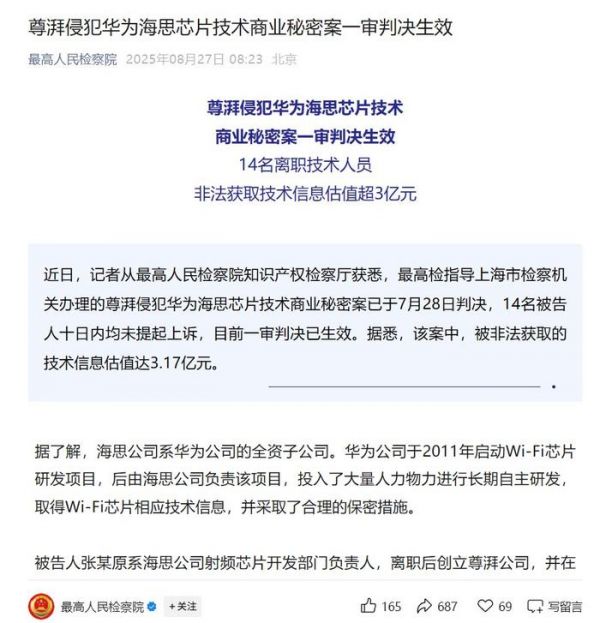 #14名内鬼侵犯华为芯片技术被判刑#