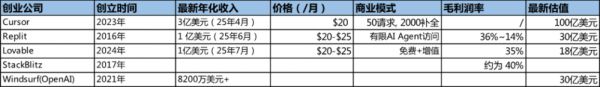来自瑞典的AI编程助手Lovable,根据Techcrunch报道(ARR),2025年7月已经突破1亿美元大关。Lovable自推出以来仅用了八个月就达到了这一里程碑,而2025年6月Lovable宣布其年经常性收入为7500万美元,简单推断Lovable一个月的收入为2500万美元。