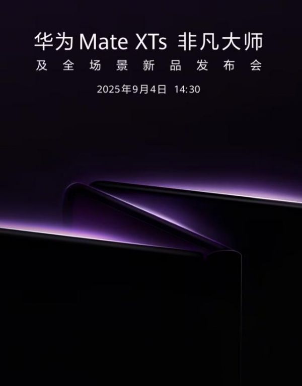 华为官宣将于9月4日14:30举办华为Mate XTs 非凡大师及全场景新品发布会,将发布新款华为三折叠屏手机。