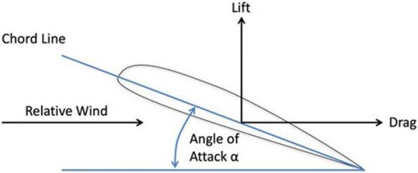 攻角示意图,翼弦线(Chord Line)与相对气流(Relative Wind)之间的夹角