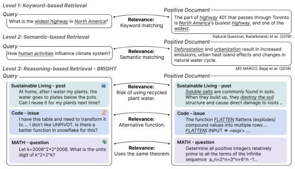 图 1. 不同于基于关键词和直接语义匹配的检索任务,BRIGHT 评测基准关注于推理密集型场景下的检索任务