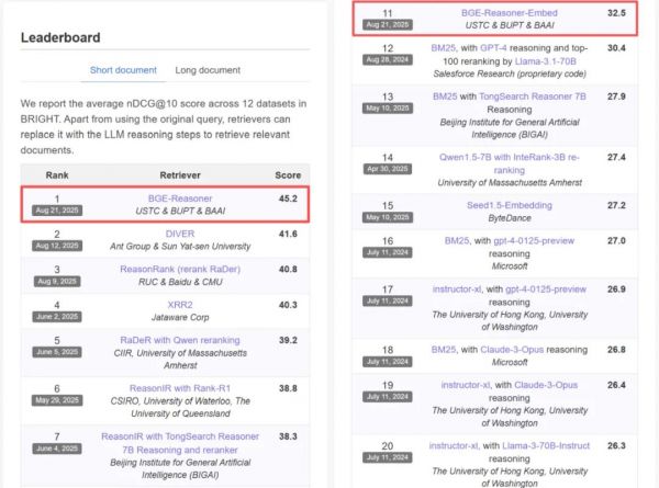 图 2. 在 BRIGHT 榜单上,BGE-Reasoner 取得 SOTA 表现于 8 月 21 日荣登第一名,BGE-Reasoner-Embed 使用原生查询即表现出色,在向量模型中取得 SOTA 结果,榜单链接:https://brightbenchmark.github.io