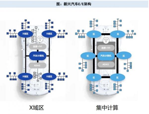 传统ECU控制方案无法满足车机互联场景下,高算力、低时延互联等需求,车载E/E架构(电子电气架构)开始转变,从域控制分布式向中央集中式转型。