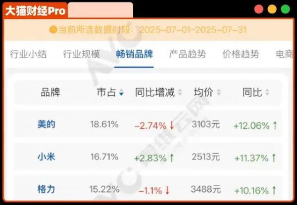 有个大V发了张图,说是“7月份中国空调线上份额数据:小米已经超过格力,位居第二了”。