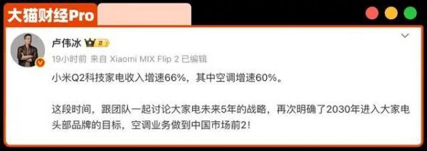卢伟冰转而说,小米要在2030年“进入大家电头部品牌,空调业务做到中国市场前二”。