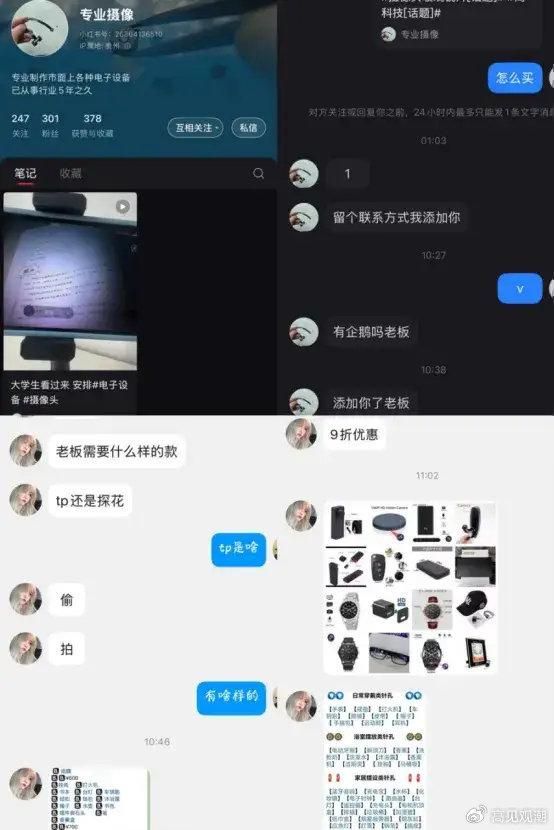 在小红书上名为“专业摄像”的博主发布了一篇笔记视频,展示其针孔摄像头的拍摄过程,私信后,该博主要求前往QQ进行交流,在QQ上该博主开门见山的表示是用于偷拍还是探花需求,并且还推荐了各种造型的针孔摄像头供选择。