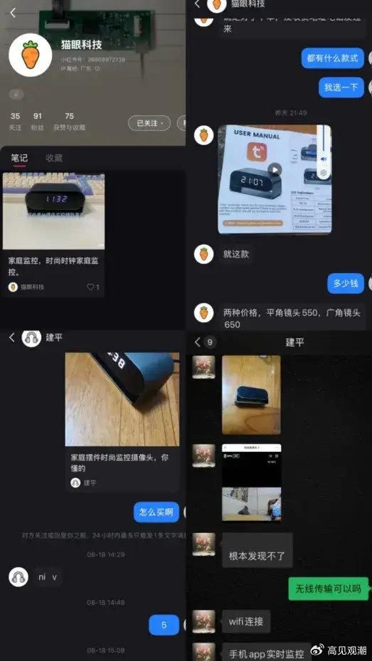 另一位名为“猫眼科技的博主则发布一则展示闹钟的视频笔记,配文是家庭监控,在小红书私聊时该博主表示,这款闹钟摄像头两种价格,平角镜头550元,广角镜头650元。