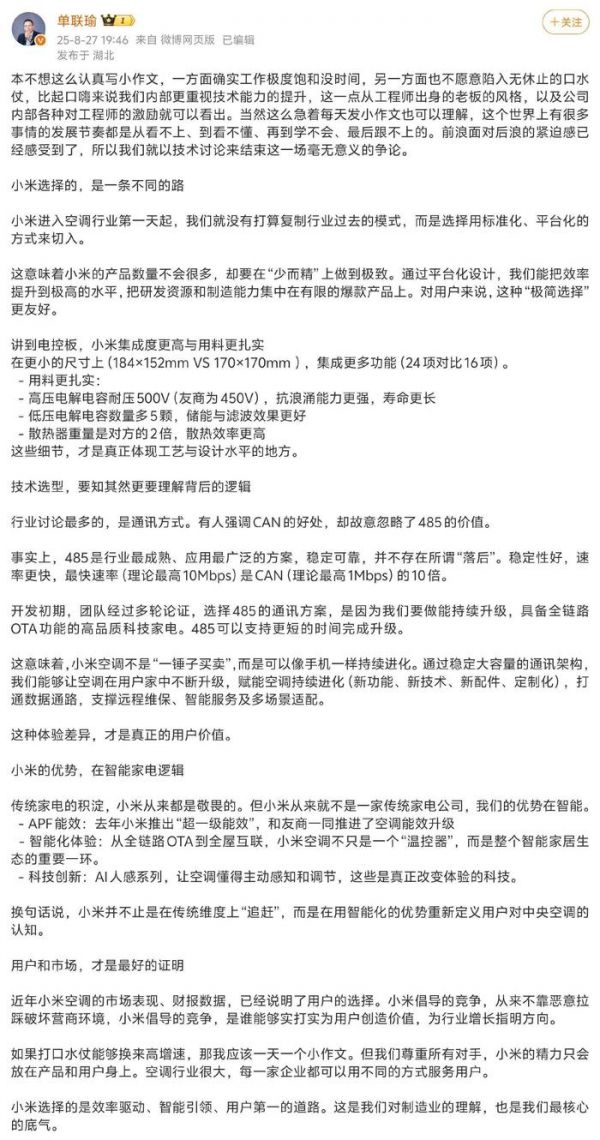 “这个世界上有很多事情的发展节奏都是从看不上、到看不懂、再到学不会、最后跟不上的。”8月27日晚间,小米集团大家电部总经理单联瑜在社交平台发布文章,就近期与格力的拆机之争作出回应。在单联瑜看来,这是一场毫无意义的争论。“如果打口水仗能够换来高增速,那我应该一天一个小作文。但我们尊重所有对手,小米的精力只会放在产品和用户身上。”