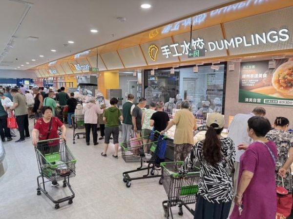 开张当天就有客人“掐点到”,热度一直持续到晚间6时许达到客流高峰,现制现售档口几乎都在排队。顾客中,有试营业体验后来“二刷”的,被“朋友圈”种草的,也有被预告吸引来的。实惠、新鲜、放心,当顾客嘴里的高频词和超市宣传语“对上了”,陈明感到这间超市的路子走对了。