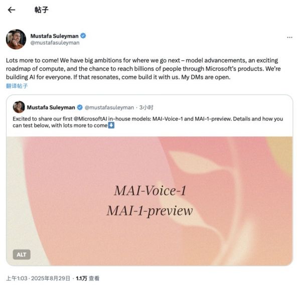 苏莱曼:这是一个很好的问题。我们是全球市值最高的公司之一。人工智能不仅是技术的未来,也是未来几十年我们进行商业交易和创造价值的方式。因此,这对我们的业务至关重要。我们必须拥有内部专业技术来打造世界上最强大的模型。这就是我们自从我大约14、15个月前从Inflection加入微软后开始这项工作的原因。现在是一个非常激动人心的时刻。我们推出了两款模型:MAI-1预览版,以及语音生成模型MAI-Voice-1。