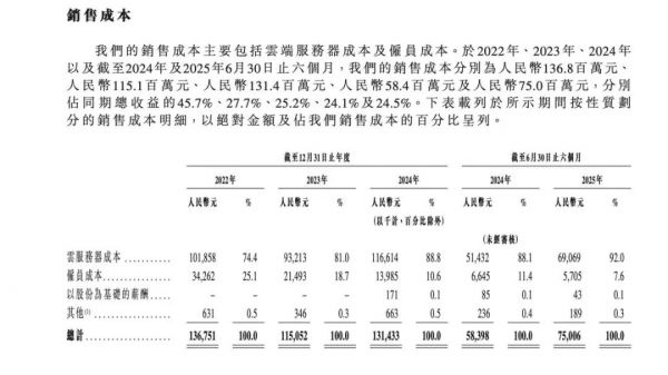 招股书数据,2022年,SaaS关键客户占比,从7.1%增长到29.9%。同期云服务成本占比从74%,增长到88.8%。2025年上半年,云服务器的成本占比来到了92%。