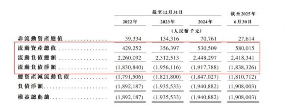 招股书来看,从2022年到2024年,以及2025上半年,公司的流动负债总额分别为22.6亿元、23.13亿元、24.48亿元及24.18亿元。