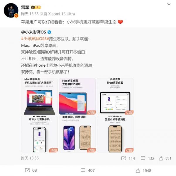 强兼苹果!小米澎湃OS 3官宣推出跨生态互联服务