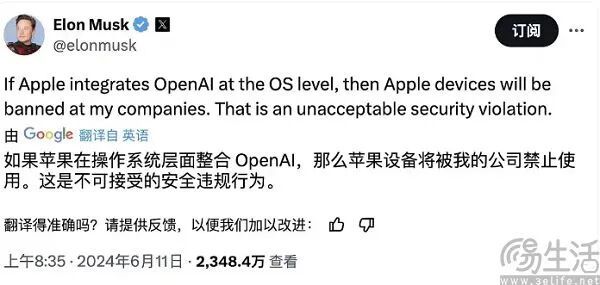 早在去年WWDC上苹果宣布与OpenAI合作,允许用户使用Siri与ChatGPT进行对话后,马斯克就站出来唱了反调,宣称苹果与OpenAI合作是出卖用户数据,并威胁要禁止旗下公司的员工使用iPhone。