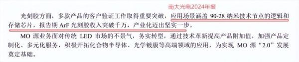 截至2024年底,南大光电已有三款ArF光刻胶产品已通过了客户认证,且已经开始向90-28nm的逻辑芯片和存储芯片批量供货,2024年的累计销售额破了千万。