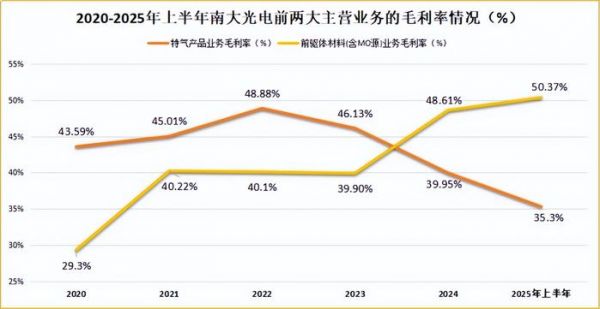 近期公布的2025年半年报显示,南大光电的整体毛利率达到38.72%,比2024年同期下降了6.83个百分点,盈利能力明显有所承压。