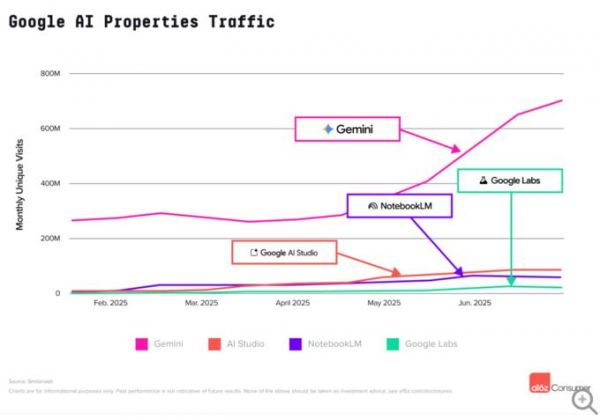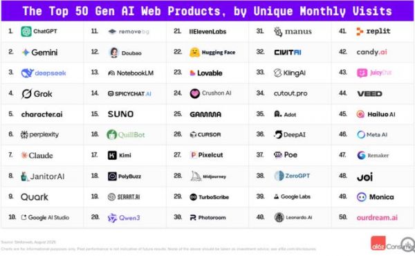 谷歌首次以独立域名形式在榜单中占据四个席位,展现其AI产品矩阵化布局效果。除Gemini外,面向开发者的AI Studio首次进入前10,学术研究工具NotebookLM排名第13,AI实验平台Google Labs位列第39。