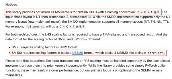 当然,英伟达本身也是支持UE8M0的,DeepSeek此前开源的DeepGEMM就使用了UE8M0,并针对英伟达GPU做了优化。