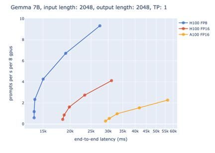而在2022年,精度进一步下探,英伟达推出的Hopper架构(H100 GPU)首次原生支持FP8。其官方博客指出,FP8在不显著牺牲模型效果的前提下,能让吞吐量翻倍、显存占用减半,这是训练GPT级别大模型时极具吸引力的优势。用博客里的测试图表可以更直观地看出,同样用H100,FP8的速度远远高于FP16。
