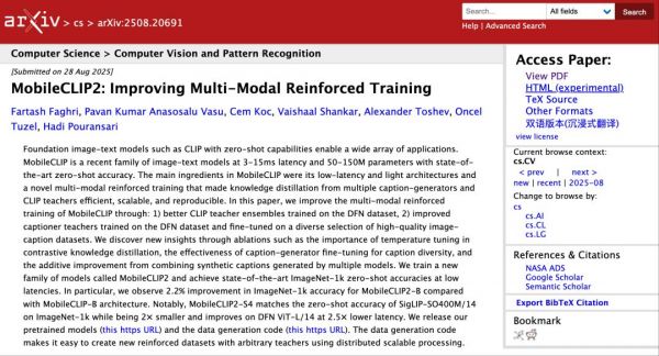 8月28日,苹果在arXiv发布新论文,介绍新一代多模态基础模型MobileCLIP2及其背后的多模态强化训练机制,同天在GitHub、Hugging Face上开源了模型的预训练权重和数据生成代码。