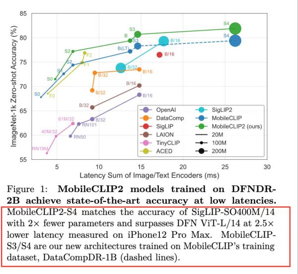 在零样本性能方面,MobileCLIP2-S4在iPhone 12 Pro Max上测得的准确率与SigLIP-SO400M/14相当,但参数量为后者的1/2;在延迟方面,MobileCLIPS2-S4的表现优于DFN ViT-L/14,延迟约为后者的约40%。