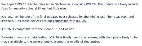 此次更新对部分老款iPhone用户而言具有特殊意义。iOS 18.7将成为iPhone XS、iPhone XS Max和iPhone XR等机型接收到的最后几轮系统更新之一。这些设备因硬件限制,无法升级至即将发布的iOS 26,因此iOS 18.7可能是它们生命周期中的“终章”版本。
