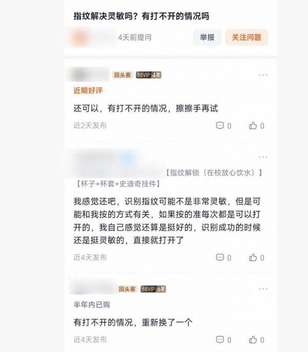 消费者评价有消费者在某款指纹水杯的商品评论区评价称:“水杯的保温效果挺好,但孩子手指有时候脱皮就打不开,所以她把之前录入的指纹都删了。”