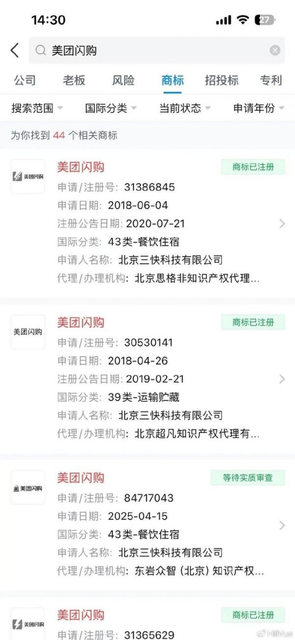 4 月 30 日,美团申请注册闪购商标/天眼查截图