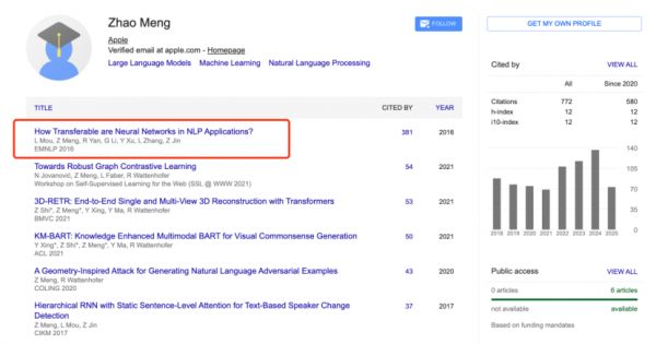谷歌学术显示,截至2024年初,Zhao Meng博士的论文总引用数已超过770次,h指数为 12。他最高引用的论文极具开创性,并且他近年的研究方向紧扣大型语言模型和多模态等领域的最前沿。