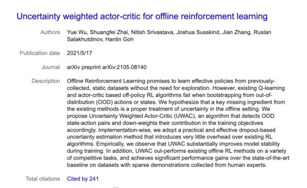 尤其是《用于离线强化学习的不确定性加权Actor-Critic算法》这篇论文,截至2021年引用超过240次。这项研究解决了在没有实时环境交互的情况下,如何利用固定的历史数据训练出高效的决策模型,是强化学习领域的重要工作。