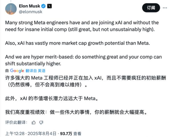 一个有意思的事情是,在Meta火热抢人的时候,马斯克曾经看似不经意地嘲讽过。他在X上透露,其实尽管xAI初始薪酬待遇没有高得“离谱”,但Meta旗下多名高级工程师正转投其人工智能公司xAI。