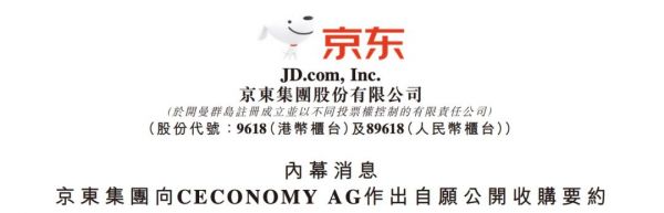 9月1日,京东在港交所发布内幕消息公告,通过京东德国向欧洲企业CECONOMY正式发出收购邀约。邀约与7月底的报道细节一致,每股作价4.6欧元,总金额约22亿欧元(184亿元人民币)。