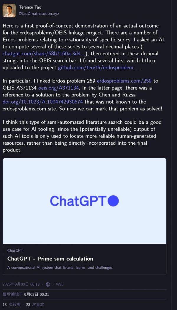 在8月31日的一篇博客中,陶对Erdosproblems/OEIS关联项目的发起过程及背后原因进行了详细介绍。