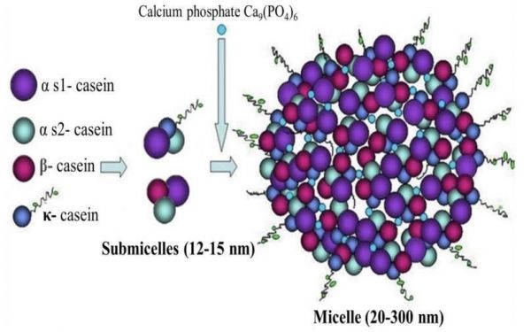 图2 酪蛋白亚胶束和酪蛋白胶束结构示意图:不同的酪蛋白分子聚集形成亚胶束,再由磷酸钙Ca9(Po4)6将亚胶束维系在一起而构成酪蛋白胶束[2]。