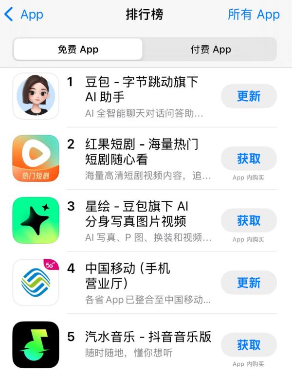 9月4日,苹果App Store中国区免费榜显示,前5名中有4个APP都在字节旗下,分别是豆包、红果短剧、汽水音乐和星绘。